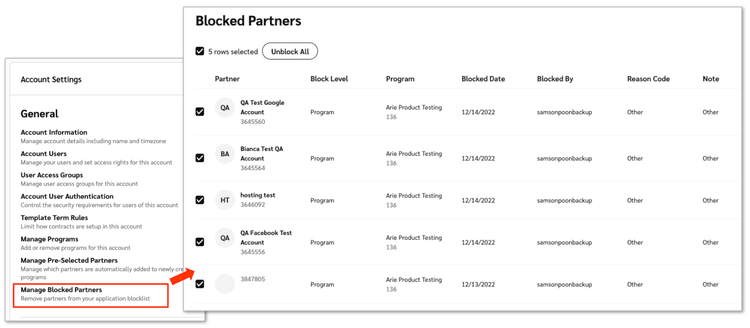 With this release, we’ve added a new Managed Blocked Partners page, accessed via your account settings. This page shows you all the partners you’ve blocked, including the user who blocked them and the reason given for the block. If you decide to give them another shot, you can easily unblock them — no support ticket needed.