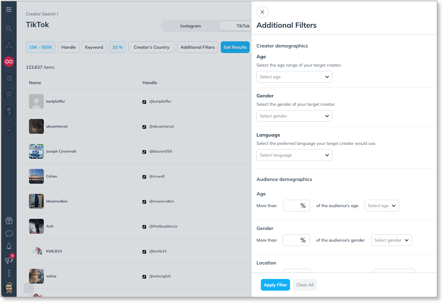Advanced filters: Narrow down creators by platform, audience traits, location, engagement, and more.
