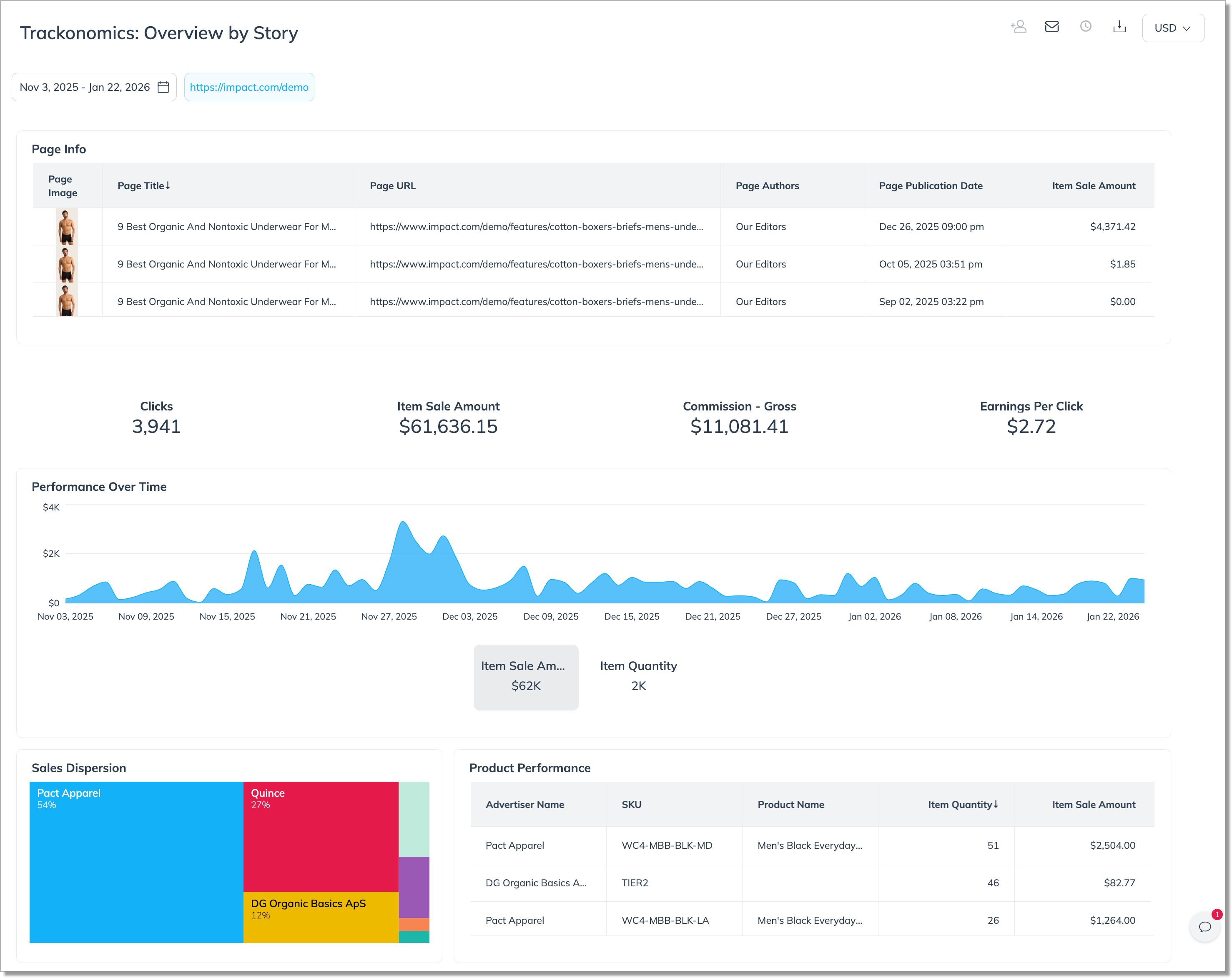 Available as part of the free Trackonomics Essentials add-on, Overview by Story shows you exactly which pages on your site are driving affiliate activity — and lets you drill down into each article to see which brands and products are performing best on that page..